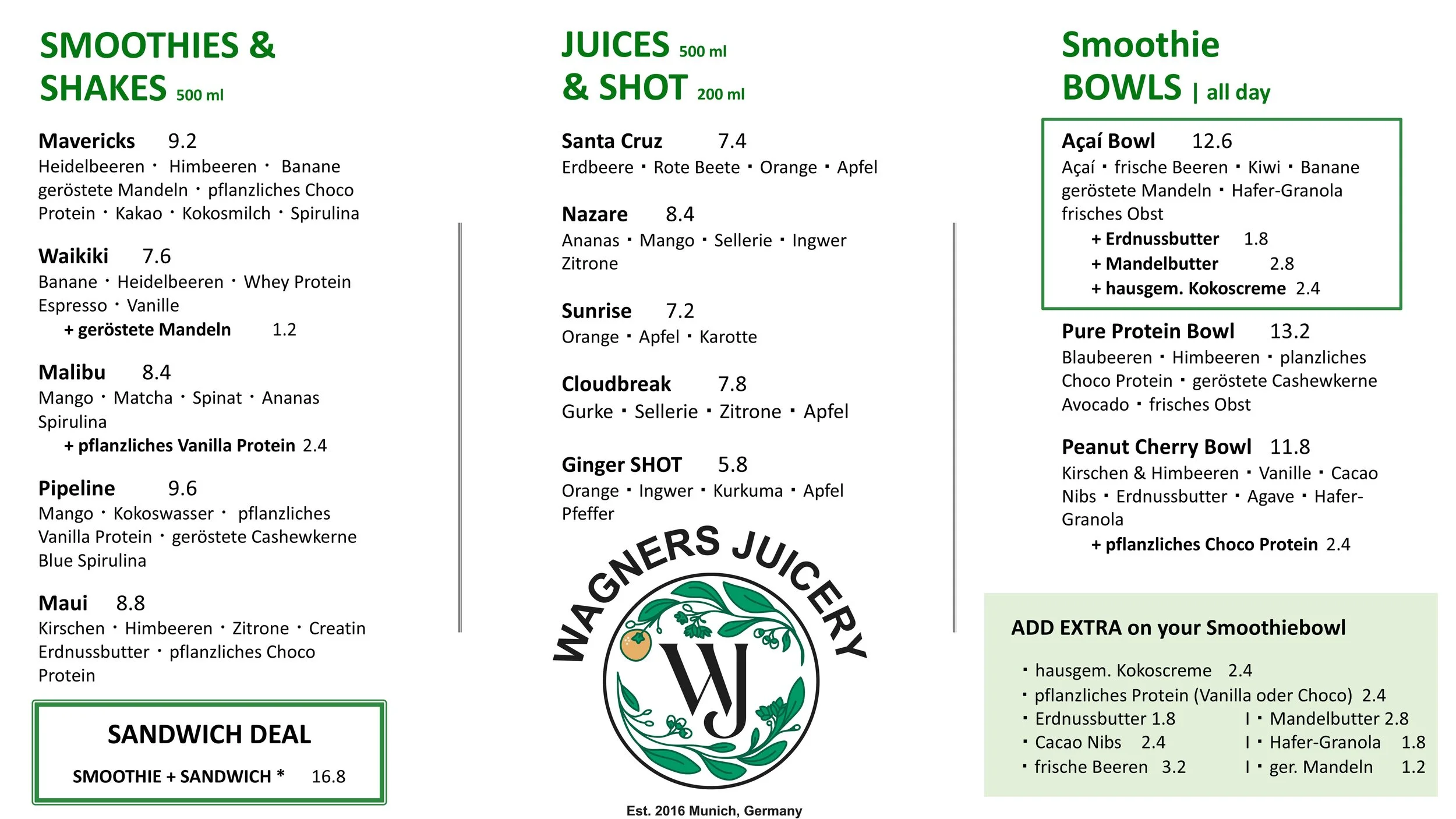 Food is not just a means to fill our stomach. For us it’s a philosophy. Inspired by the Hawaiian and Californian way of life - it’s a light and nature-driven answer to our everyday. Our authentic approach of bringing healthy options of surf culture to your cups and plates - Just natural food and drinks with a dash of the pacific spirit.